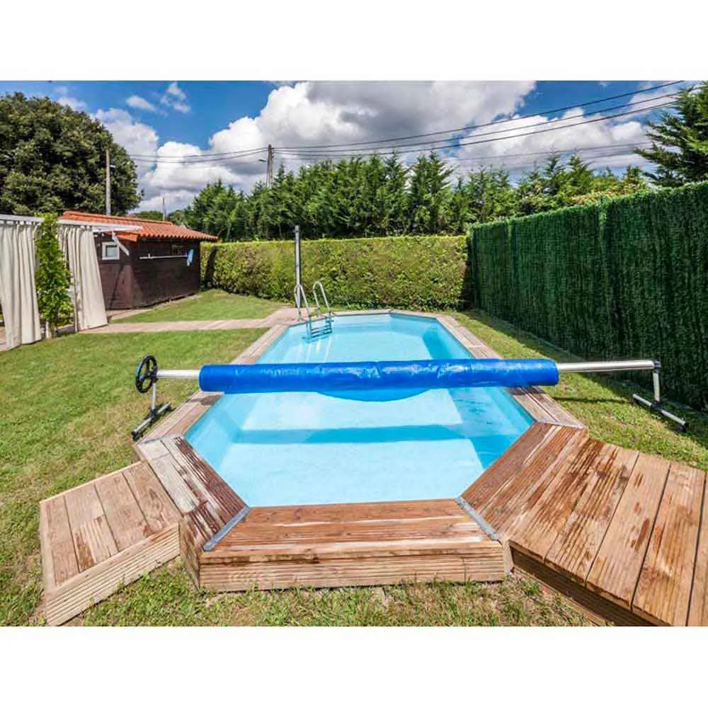 Cover roller for elevated pools. It is easily fixed to the ´´beaches´´ of the pool with 2 screwed plates. The use of the roller allows a better conservation of the cover. It includes connectors for tubular pools.