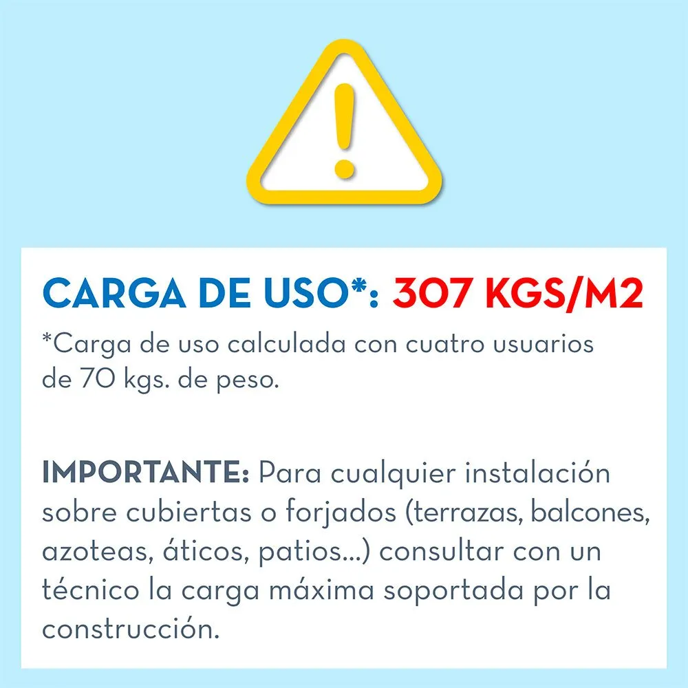 Complete your INTEX spa with the packs and add the accessories you need, tailored to you!- Have a relaxing bubble bath with warm water without leaving home in your INTEX inflatable spa, the best way to end or start the day!Material:Laminated PCV and liner with 3 layers, interior with INTEX FiberTech, greater strength, durability and rigidity for the entire edge of the spa – Interior diameter:165cm, exterior 216 cm and 71cm height, 1098 litre capacity, recommended for 6 people (8+ years), spa with 140 air outlets – With cartridge filter that filters 1,741 litres/hour, uses S1 filter (2 included) and is activated from the control panel, with anti-limescale system – Includes:insulated floor and cover with safety catches, floating chlorine dispenser, 2 S1 cartridges and transport bag