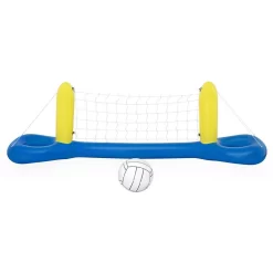 Take this Intex Fun Goals Game to a park or on your next visit to the pool and enjoy a game of water polo or a soccer challenge with family and friends. The inflatable goal post structure floats on top of the water, allowing you to test your skills scoring goals. When using in the water, fill the anchor bags with sand to help keep the goals game from floating away. Additionally, the delivery also includes an inflatable volleyball and a repair patch. Important note: It is recommended for use by children over 6 years old under adult supervision. Colour: Yellow and white Material: Vinyl Dimensions: 140 x 89 x 81 cm (L x W x H) 0,25 mm vinyl with 0,18 mm ball Includes anchor bags and an inflatable ball Goal base has grommets for anchor weights if desired Suitable for children over 6 years old Includes a repair patch Intex item number: 58507NP