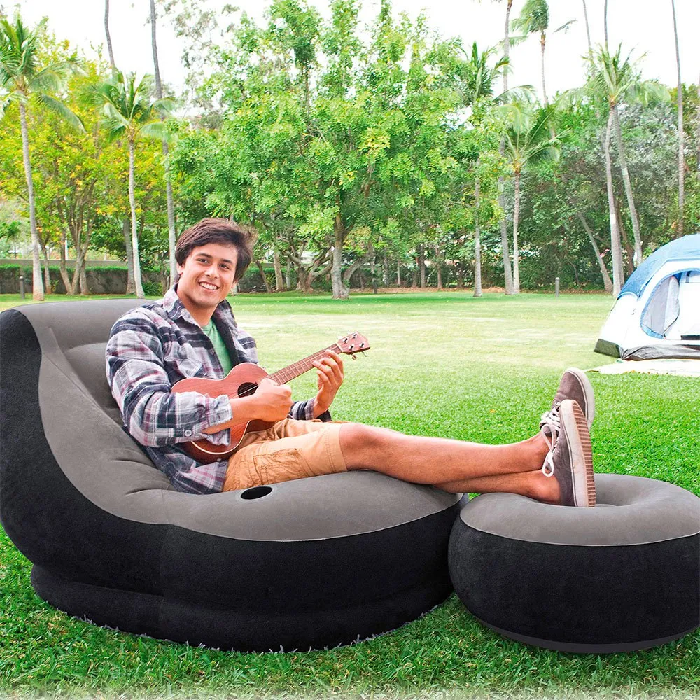 Intex inflatable chair with separate footrest, grey with a black base, measuring:99x130x76 cm for the chair and 64×28 cm for the footrest.