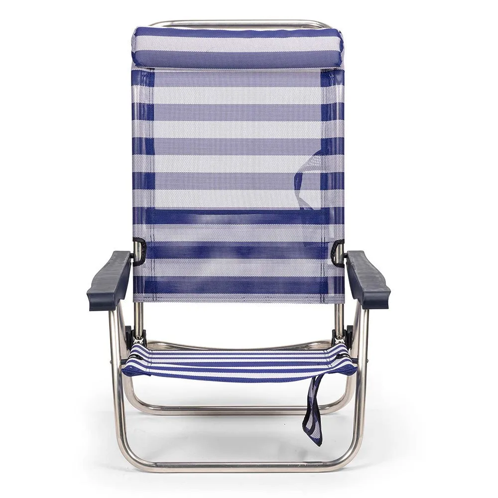 Beach chair-bed, aluminum tube, textiline, with back pocket, with handles, and with height adjustable head.